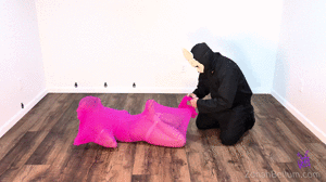 Zonah Bellum is naked, barefoot, and wrapped in plastic wrap by Usagi Lapin. She's left there to struggle a bit before he comes back with a surprise instrument. He uses a metal paddle to spank her before leaving her hanging again now with a sore red bottom. Before too long he's back with a cane and is after her soft soles. That's not the last surprise though..